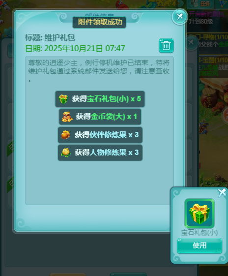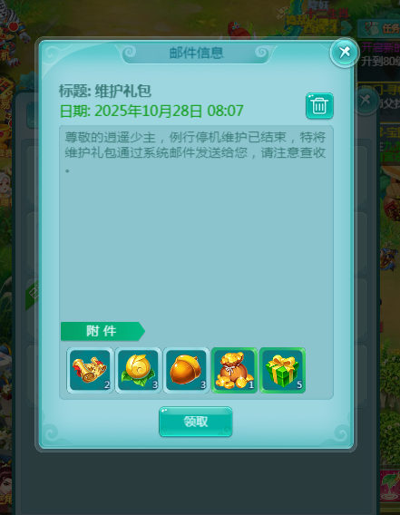 游戏通常会在每周二进行数小时的停服维护,在此期间少侠们将暂时无法登录。为了感谢大家的耐心等待,维护结束后,一份精心准备的维护礼包便会自动发放至每位少侠的邮箱,真正实现"人人有份,永不落空"。
