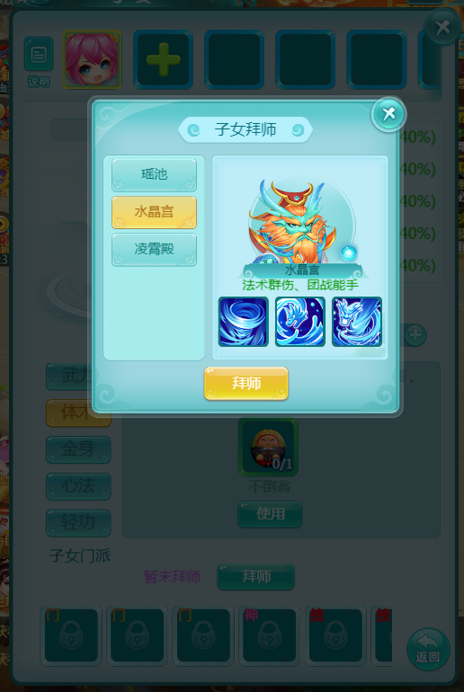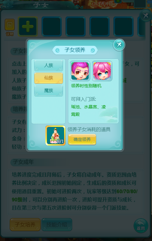 当孩子达到适学年龄,你可送他前往同种族的门派拜师学艺。入门后,孩子将掌握该门派的一项特色技能,并在后续的进阶修行中逐步领悟另外两项技能,形成完整的技能体系。