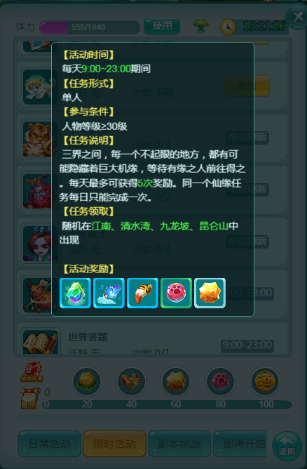 游戏中现有12种各具特色的仙缘任务,它们会随机出现在江南、清水湾、九龙坡、昆仑山等场景地图中。由于刷新位置不固定且不易察觉,少侠们在游历四方时务必留心观察,否则很可能与这些难得的机缘失之交臂。