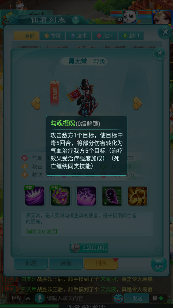 黑无常的核心治疗手段来自其招牌技能“勾魂摄魄”。该技能在攻击敌人并使其中毒的同时,还能将造成的伤害转化为气血,为我方最多5个目标进行治疗。这种攻防一体的设计,让他在输出的同时兼顾团队续航,实用性极高。