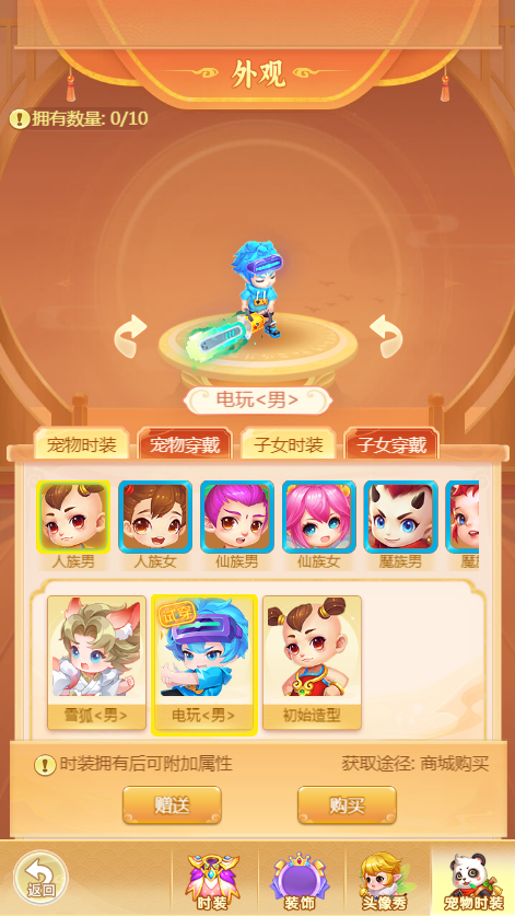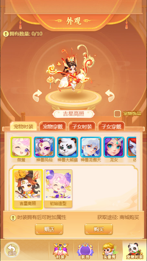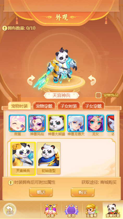 和角色时装一样,宠物时装也是在“外观商城”中购买的。此外,你还可以打开宠物详情界面,在宠物模型左下角找到一个“时装”按钮,点击亦可直接跳转至商城的相关页面,操作非常便捷。