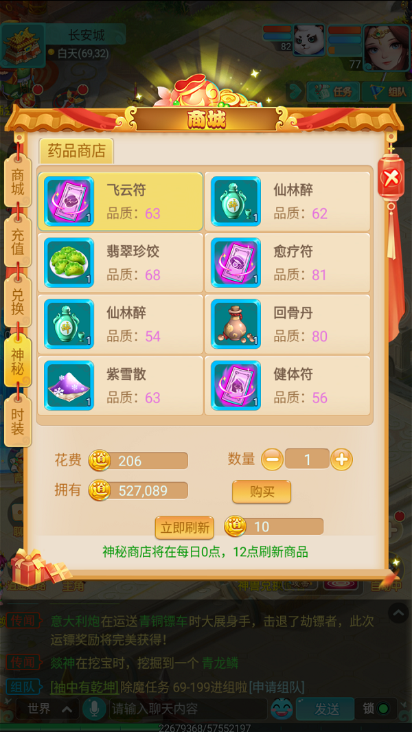 神秘商店的最大特色,就是商品不固定。从附魔符、药品、酒品到各类美食,应有尽有,而且品质普遍不俗。如果你自己帮派技能还没点高,做不出高品质的消耗品,不妨每天来这里逛一逛,说不定就能顺手补个货。