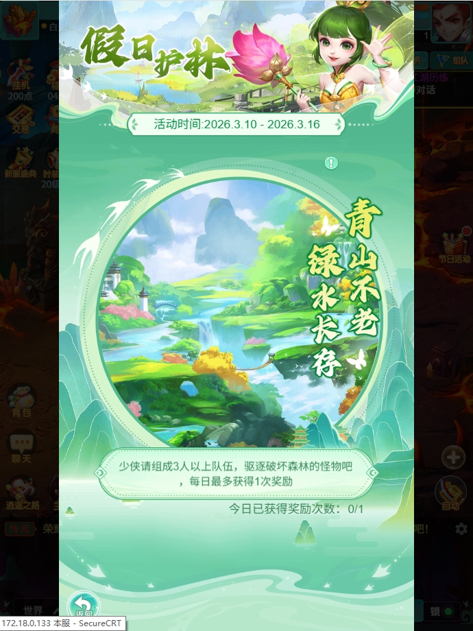 植树节来临,亲手种下一棵棵树苗,为绿化环境尽—份力吧!少侠每日可为自己的植物浇水一次,可加快树苗的生长速度。树苗成熟后,便可获得丰厚奖励。每天还可以帮助其他玩家浇水两次,每个玩家每天只能被帮助浇水两次。