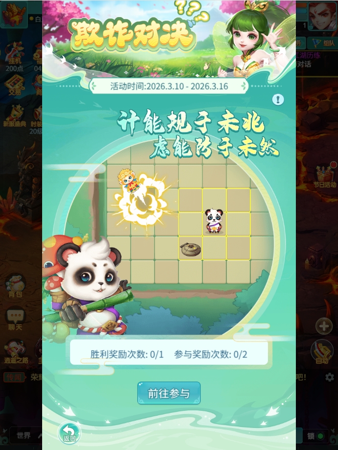 到长安城找到游园使,与之对话开启匹配。活动场地为8*10的格子,游战J开始后玩家可以操控卡通角色在格子上行走。角色初始拥有3个地雷,可以点击地雷在自身周围的九宫格内放置地雷,放置过程仅自身可见,放置后短暂显示给玩家自己,之后双方都不可见。角色踩到放置地雷的格了会触发地雷爆炸,随即被淘汰。每个角色初始有一定的存活时间,倒计时结束即淘汰,可通过拾取地图上刷新的面包延长存活时间。