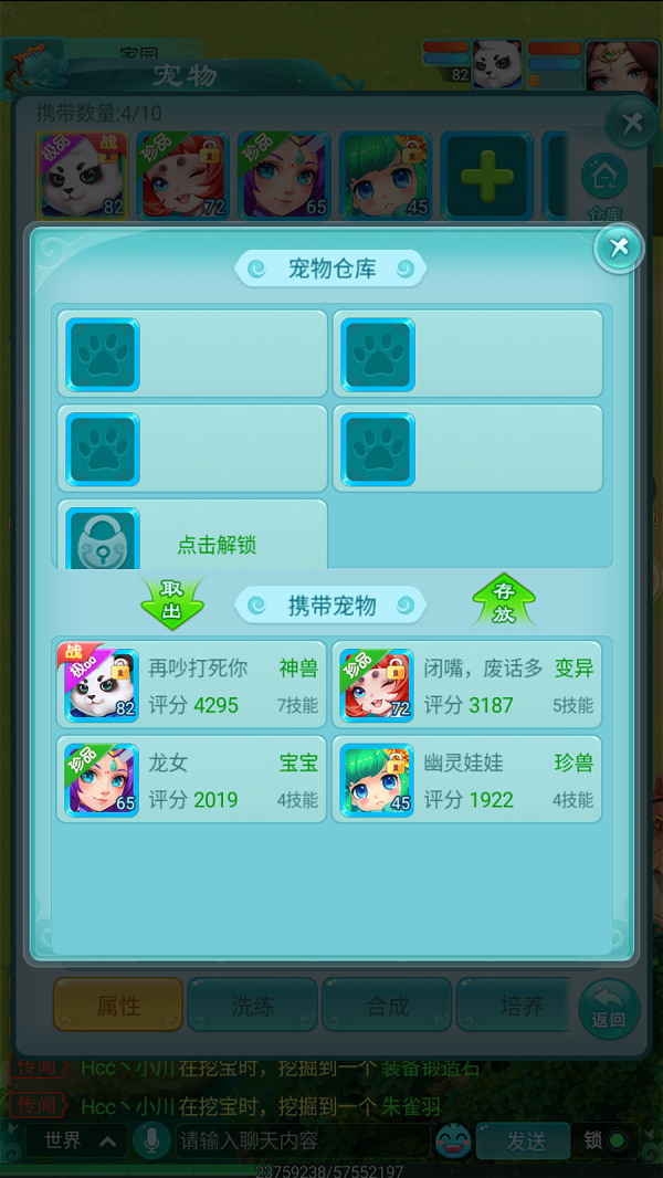 宠物方面也是类似的道理。通常情况下,每位少侠最多只能随身携带10只宠物。超出部分,可以存进宠物仓库。在宠物界面的右上角,就能找到宠物仓库的按钮,点击后即可将身上的宠物移入其中。