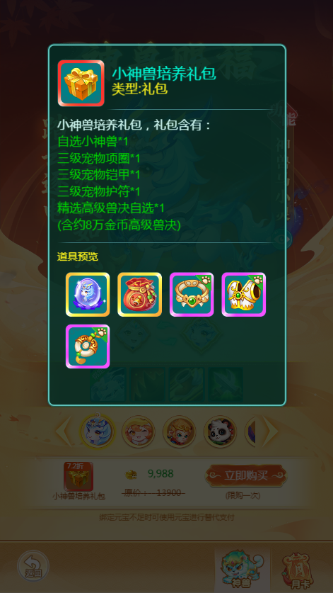 该礼包原价13900元宝,如今仅售9988元宝。内含一只自选小神兽、一个**宠物项圈、一副**宠物铠甲、一件**宠物护符,以及一份精选高级兽诀自选礼包——全都是培养神兽时非常实用的道具。