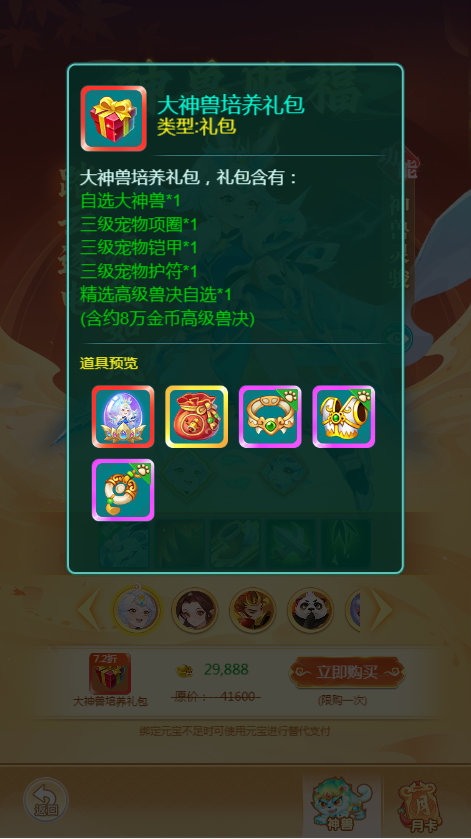 同样的,切换到“大神兽”页面,就可以购买大神兽培养礼包。该礼包原价41600元宝,现在只需29888元宝即可入手。内含一只自选大神兽,其余道具与小神兽礼包基本一致。