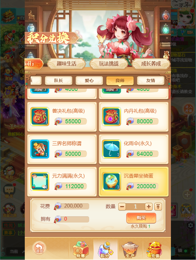 在师徒界面的“师徒值”子页面中,可以看到通过师徒值可以兑换的各种奖励。除了大量礼包、金币袋之外,还有一个形似羽毛扇的道具——那就是“良师积分”。有了它,你就可以在良师商店里兑换更稀有的好东西。