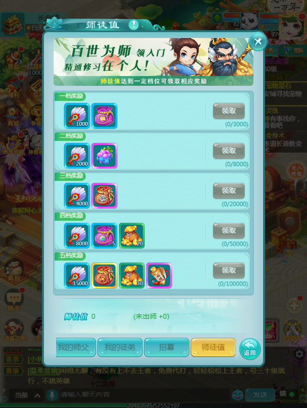 在《逍遥情缘》手游中,如果你乐于收徒、悉心教导,最终桃李满天下,系统也会给予相应的回报。师徒系统中有一种叫“师徒值”的积分,当你招收徒弟并一路指导他们顺利出师,就能积累大量师徒值——而通过消耗师徒值,你就能换取丰厚的奖励。