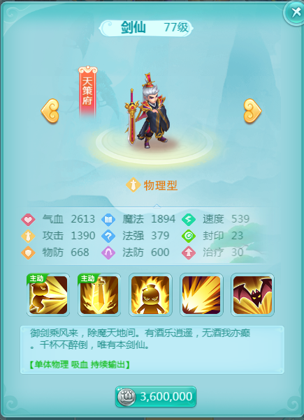 剑仙的拿手输出技能自然是天策府招牌的三段式“千军破”,可以对一个目标造成大量伤害,但是施展完后需要休息一回合。还有就是可以召唤虚无剑气攻击多个目标的侠客行。