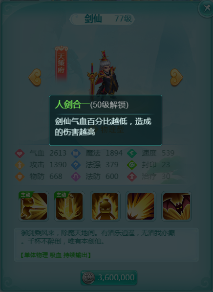 如果只是拥有两个天策府输出技能,那只能说平平无奇,而亮点在于他的被动上。人剑合一可以让剑仙在气血较低的时候,造成更高伤害。所谓险中求胜,必须将自己置于险地,才有超常发挥。