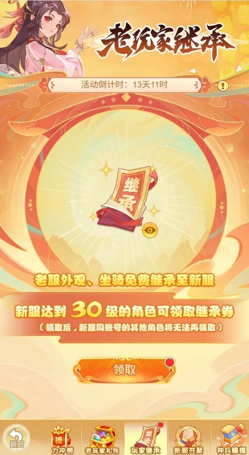 (1)新服达到30级的角色可领取时装、坐骑继承券;