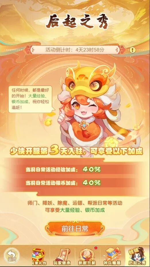 (1)活动期间内将根据服务器开启后首次登录的天数,获得一定量的经验、银币加成;