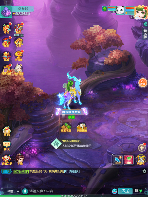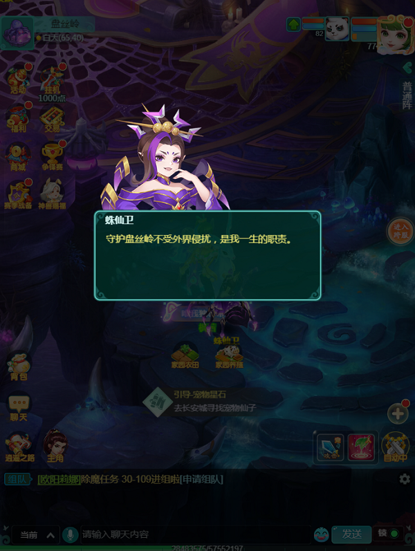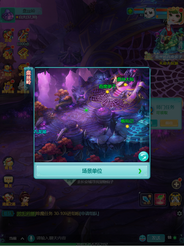 通过九龙坡角落的一处传送阵,便可抵达盘丝岭。打开小地图一看,洞穴的结构倒也简单——从大门口一路向前,便能走到掌门所在的御座平台。不过整体色调偏紫,第一眼就给人一种神秘莫测的感觉。